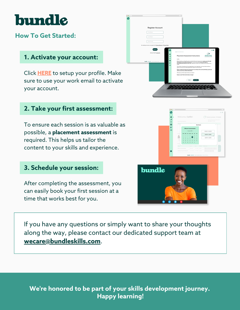 I designed the Welcome to Bundle one-pager for learners—a friendly, accessible intro to what they can expect from their Bundle experience. The layout was clean, the tone inviting, and the visuals intentionally human-centered to ease folks into the platform without overwhelming them. Think of it as part onboarding tool, part pep talk—all wrapped in a clear, approachable design.